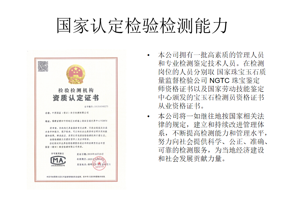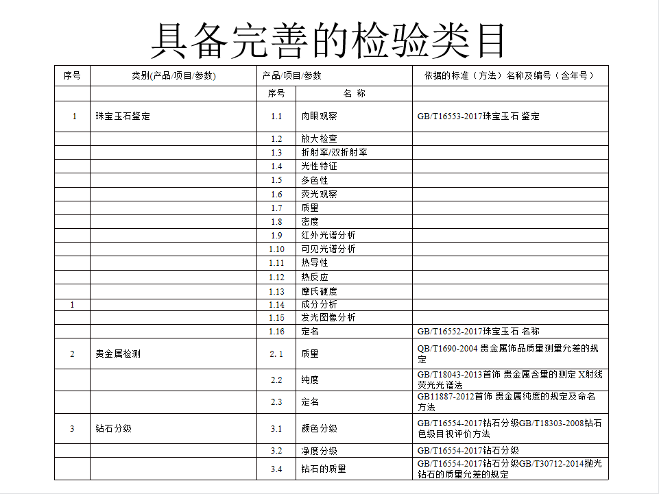 本公司具有良好的检验环境和安全保障设施。 公司按国际标准进行实验室管理,对影响检测、鉴定质量的诸因素进行有效的控制,对黄金珠宝首饰的质量作出公正的、科学的、准确的评价。本公司开展检测、鉴定工作的依据是有关的国家标准,行业标准或企业标准,也可以按委托单位提出的要求进行。本公司使用的计量检测仪器均能满足所执行标准的检验要求,全部仪器设备均检定合格。本公司的检验工作严格按照标准和相应的检测、鉴定的细则进行,检测和鉴定结果的判断以数据为依据,绝不受商业、财政、外界和其它利益的影响。本公司所有的人员不从事受检产品的技术开发和技术咨询工作,严格保守用户的秘密。本公司制定的一套完整严密的规章制度,能确保检验工作的质量。当用户对本公司的检验结果有异议时,可提出投诉,本公司有妥善处理投诉的规定。